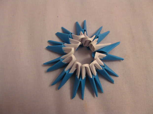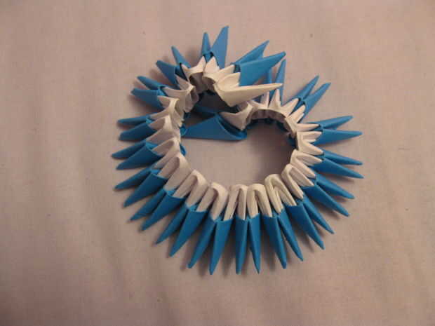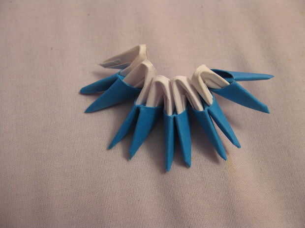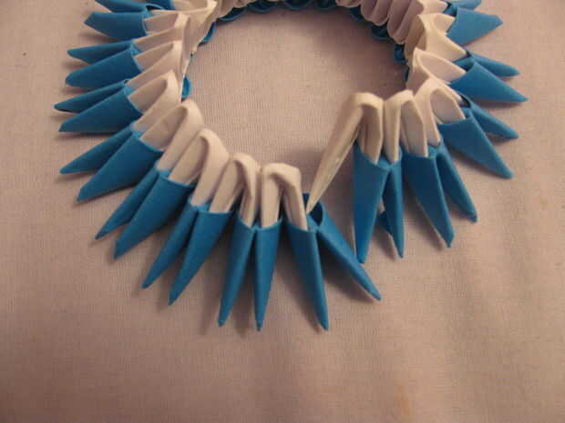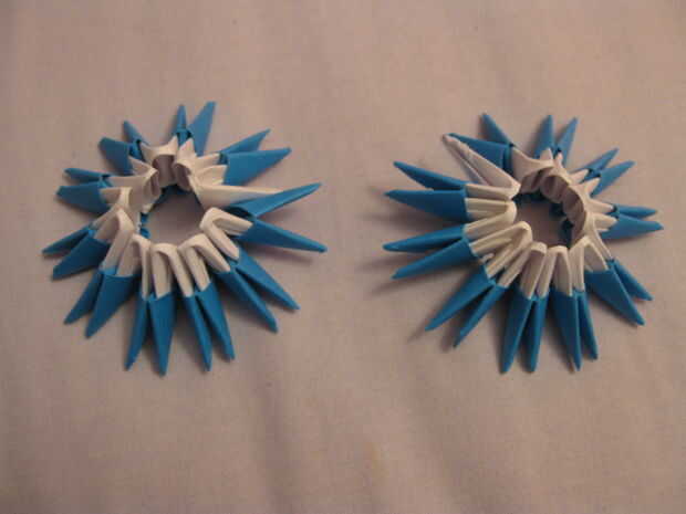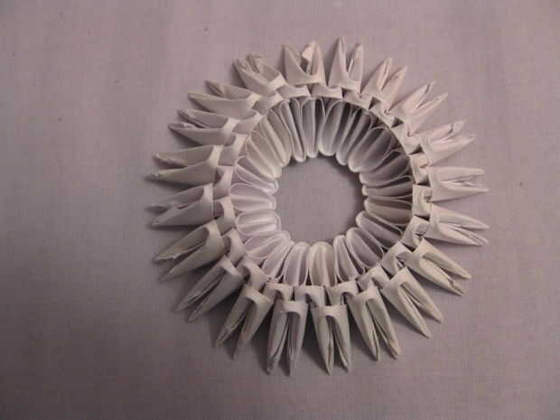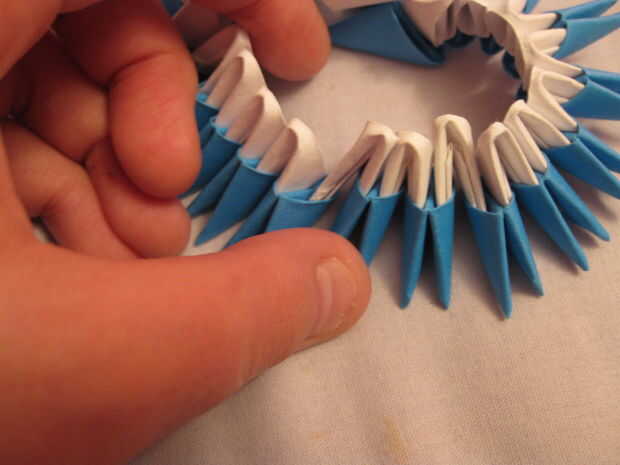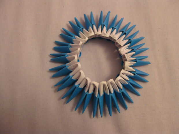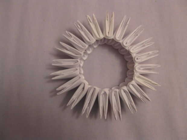 A continuación, vamos a ranura los veinte pares juntos para hacer un anillo. Construir sobre una superficie plana para que no se romperá. El otro punto de la ranura del triángulo superior de un par en el bolsillo de otro triánguloy repetir hasta diez pares se han utilizado. Hacemos anillos de diez pedazos dos veces en lugar de veinte piezas una vez porque las piezas tienden a rizarse. Repetir el proceso por lo que tiene dos anillos de diez. Desde aquí, punto de unir los dos anillos juntos por una asignación de un anillo en el bolsillo del otro anillo. Una vez terminado, tomar el último punto y la ranura en el bolsillo final para crear un anillo. Desde aquí, con cuidado voltee la pieza. Ser muy suave, como el anillo será muy débil y se puede romper!