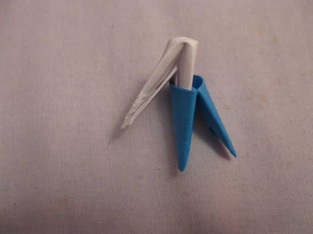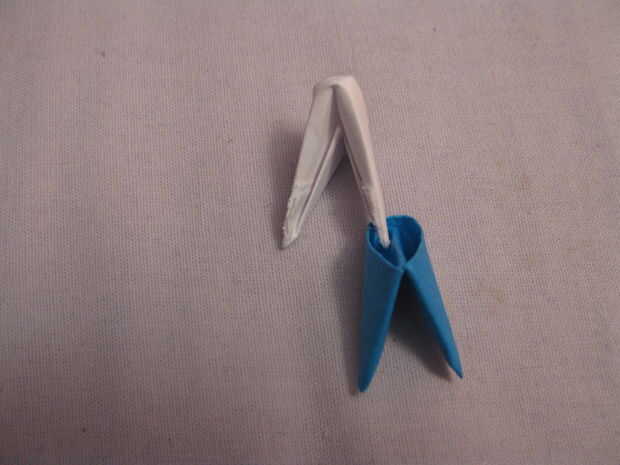 Para hacer un par invertido, tomar dos triángulos. En las fotos que adjunto, el blanco representa el primer triángulo, y el azul representa el segundo triángulo. Tomar el primer triángulo y manténgalo así las pistas delante de la cara. Tomar su segundo triángulo y Dale la vuelta, para ver las piezas de la parte inferior del triángulo. Un punto en un bolsillo de la ranura. Repite diecinueve veces!