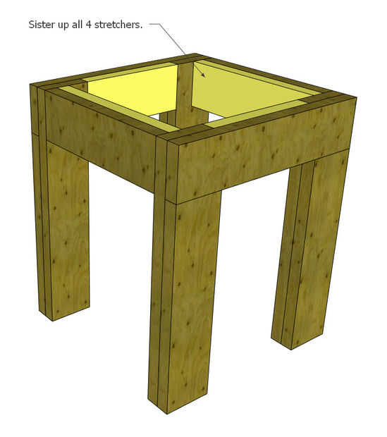 Lo siguiente es que hermana a los separadores de 4 piernas para reforzar un poco.  Para esto, usted necesitará dos 18" y dos 13" piezas de 2 x 6.  Encolar y atornillar en su lugar.