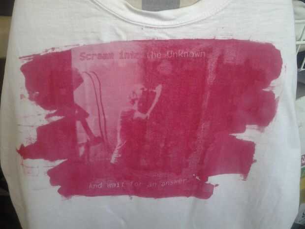 Además, asegúrese de que utilizar cartón y no hay impresión en él! Empapado de la tinta a través y no visibles en la foto, algunas letras débiles que tienen absorbida por el tinte mojado sobre la camisa.
