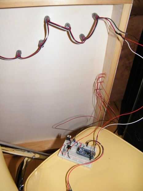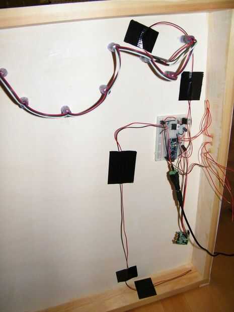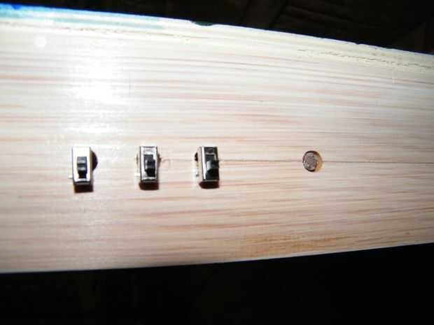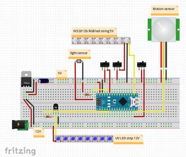 Adjunto encontrará también los esquemas electrónicos. Funciona así: cuando la habitación es oscuro (sensor de luz) y se detecta a alguien acercarse (sensor de movimiento), entonces encenderse los leds blacklights, las estrellas (RGB LED) y 10 de ellas brillan al azar, y después de que todo lo vuelve oscuro. Los interruptores pueden ser usados para: desactivar los leds RGB, desactivar el sensor de luz o desactivar el sensor de movimiento.
