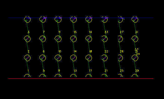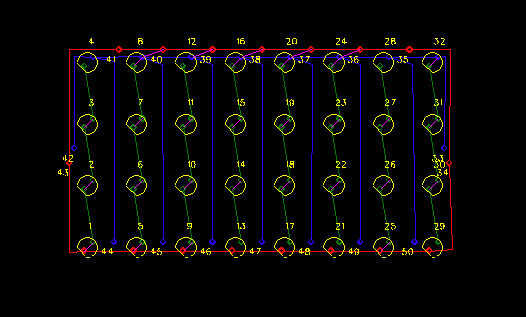 En la primera imagen ver el principio básico de la PCB: 8 series de 4 LEDs con dos polos (los cables). Una vez que cada cable está conectado a un cable de un adaptador de 12v, el siguiente PCB sólo necesita las conexiones entre el azul y los cables rojos de la placa anterior. En la siguiente imagen puedes ver el PCB real, el cual es básicamente el mismo, sólo con postes extendidos de manera que el PCB pueden ser conexión mucho más fácil (más posible puntos de conexión). Ahora la idea es hacer una secuencia, una cadena de PCBs, no un lazo. Empezaremos con en el paso siguiente una vez se han soldado los cables de la primera en los cables de un adaptador.