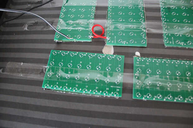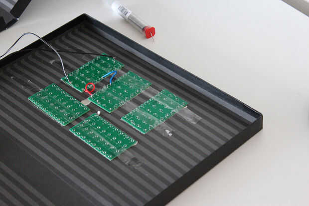 Ahora que la primera placa está conectada, es hora de conectar esta placa a las otras placas. Empezamos con el uno a su lado. Para conectarlos juntos, la línea exterior de la primera placa tiene que continuar a la segunda (yo usé cable rojo para esto). Enrollado el cable para asegurarse de que tengo suficiente dilatación sin demasiada tensión en el cable, lo que facilita la soldadura. Una vez que la línea externa está conectada, la línea interior puede conectarse utilizando el mismo principio. Utilicé los cables azules para conectar las líneas interiores.