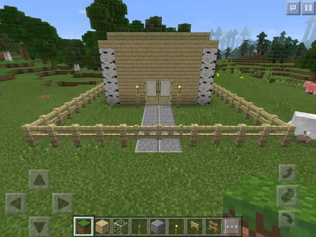 Rodear su casa con cercas. Hice las cercas 2 lejos de las paredes laterales y 3 de la pared posterior. Pongo las 5 de la pared frontal. Entonces hice un camino de 2 x 5 frente a las puertas. Luego amplié el camino del otro bloque y poner las puertas de valla sobre los últimos bloques de la vía.