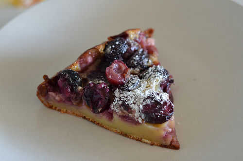 Este es un tradicional postre francés de la región de Limousin de Francia. Si no tienes cerezas por parte también se puede hacer este cocido natillas o flan, con ciruelas, ciruelas pasas, manzanas, arándanos o moras. Los puristas dejan en las semillas de cereza, supuestamente da el clafoutis más sabor cereza, pero elegí hoyo mis cerezas, así que usted puede realmente disfrutar de comer sin escupir hoyos (eww!)