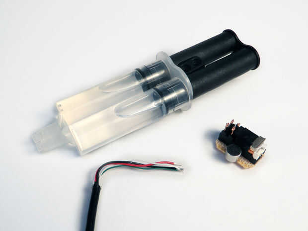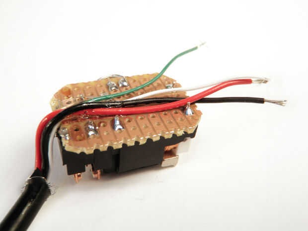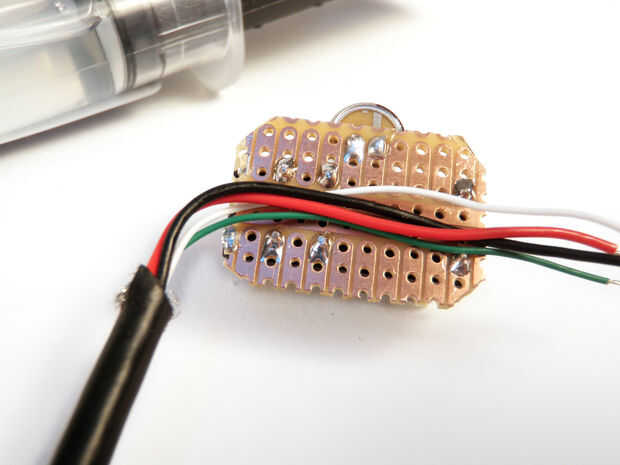 Quitar 2"- 3" de la chaqueta del extremo libre del cable USB. Epoxy, el color de los cables el tablero de circuito pequeño, que todavía tiene cierto margen de wiggle para trabajar con (es decir, tira y soldadura) los cables.