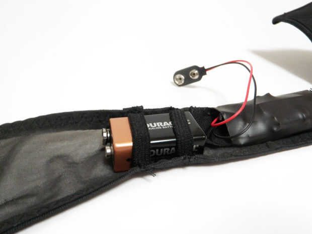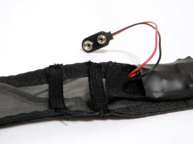 Coser las correas elásticas perpendicular a la correa del sujetador en la parte superior e inferior (que llevará a cabo la batería). Cuando haya terminado, extraiga la batería de 9V debajo de las correas.