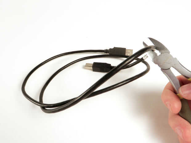 Tomar el cable USB y cortar cada extremo que te queda una sección de cable de aproximadamente 6" a 8" de largo.