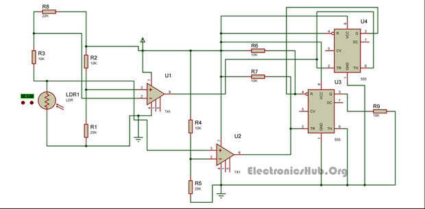 este es uno de los circuitos muy útil llamados "Auto noche lámpara utilizando LEDs de alta potencia". Se trata de un simple circuito que enciende luces de encendido el LED conectadas a él por la noche y apaga las luces automáticamente cuando es