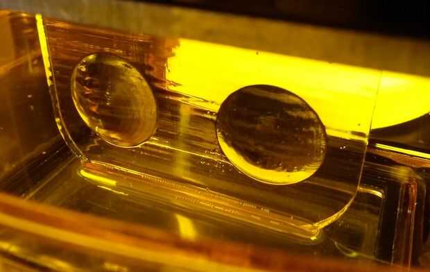 El modelo adjunto de un par de lentes se ve así mientras se está imprimiendo en brasas, con resina transparente estándar de Autodesk. Todavía está cubierto con resina líquida sin curar, que tiene una superficie lisa (debido a la tensión de superficie) que permite ver el interior y justo por la parte impresa.