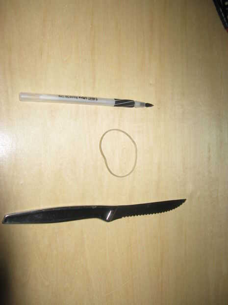 los materiales son un bic ultra round stic grip pen, una banda de caucho y un cuchillo.