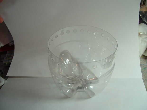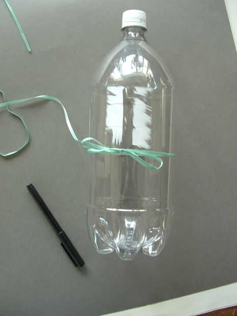 Primero limpié mi botella, restregar las partes pegajosas con mantequilla de cacahuete se salga del todo. (Tienes que raspar los restos de la etiqueta plástico blanco apagado con agua caliente con la uña del dedo). Luego, ató una cuerda alrededor de la mitad de la botella y trazó una línea alrededor de derecha por debajo de la cadena. Utilicé la cinta al principio, pero luego usé un hilo dental, y creo que funciono mejor pues no deslizarse. También usé un lápiz a base de agua para dibujar mis líneas porque quería mi monedero totalmente claro, pero un "rotulador" quedaría en mejor, así que es usted. Cortar la botella con un cuchillo x-acto. Luego dibujó otra línea sobre una media pulgada hacia abajo y perfora una línea de agujeros de 1/4 de pulgada separado con una perforadora.