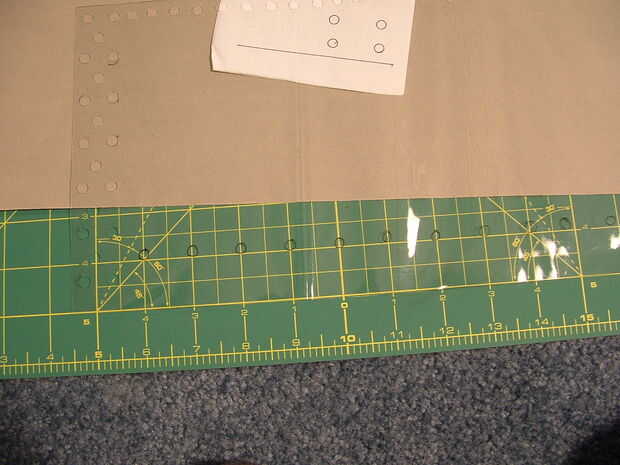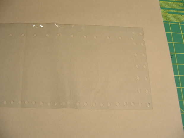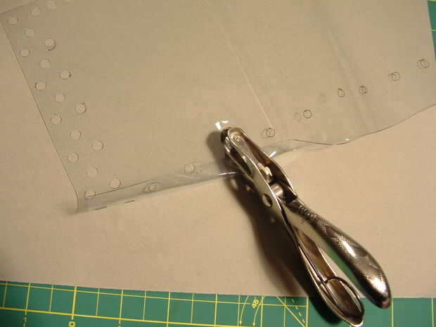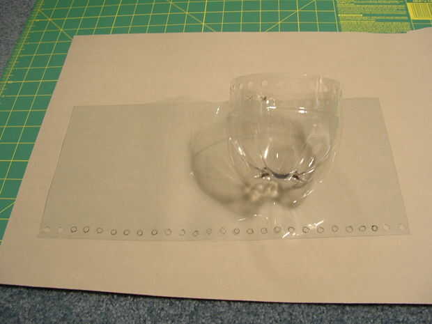 Tiempo para cortar el vinilo por la parte superior. La corté 14 1/2 pulgadas de largo y 7 pulgadas de alto. Entonces envolvió alrededor de la parte inferior. Deben superponerse sobre una pulgada y 1/8. Había marcado los 2 orificios donde se superpone sobre dos piezas de vinilo y marcó los dos agujeros que utilizaba como punto de partida, con una x debajo de ellos. Esto sólo ayuda a mantener los agujeros que ha perforado alineados mejor. Perfora hacia fuera los 4 agujeros en el vinilo, el vinilo a colocar en la botella y marcó el resto de los agujeros en el vinilo encima de los de la parte de la botella para que preparar. (Ver imagen) Ahora, por supuesto que perfora hacia fuera el resto de los orificios de la parte inferior. A continuación puede perforar los orificios laterales en el vinilo. (En un extremo de la mina, que iba a hacerlo más complicado, y entonces he cambiado mi mente. Así que hay un agujero extra en el centro por un lado, simplemente ignorarlo.) Lo que hice fue medir los cuatro orificios en la parte inferior (sobre una pulgada cuadrada) y punch, entonces tome un pedazo de papel y traza los cuatro agujeros en él, además de borde de vinilo. Entonces mover hacia abajo los dos orificios de la línea a la vez y localizar los agujeros en el vinilo. Así que tengan un espaciado uniforme sin tener que medir a todos. Ahora que perfora los agujeros. A continuación se perforar los agujeros para el cordón. Terminé a colocación en la tabla de cortar y dibujar pequeños círculos una pulgada aparte. Esto fue un poco más lejos que podría llegar mi sacador de agujero, así que doblé el vinilo un poco por lo que podría perforar los orificios. Ahora que lo veo, deseo había perforado los abajo un poco más sobre el vinilo, aunque entonces no creo que se les pueden perforar con una perforadora. Sin embargo, podría utilizar una perforadora para cuero, una perforadora de resorte (tal vez, no estoy seguro este sería suficiente), o un sacador de agujero que usted puede golpear con un martillo. Por otra parte, sólo pudo cortar un agujero con un módulo x-acto, pero puede romper más fácil. También puede usar un clavo caliente, si te sientes aventurero, pero no sé si recomendaría o no. :)