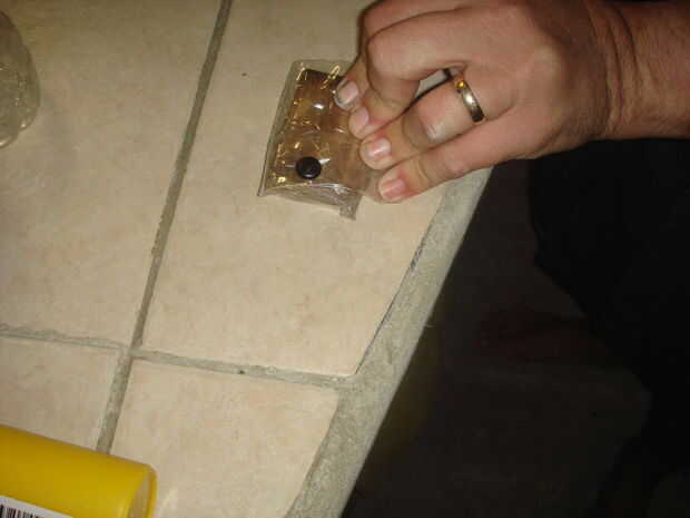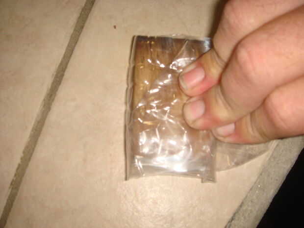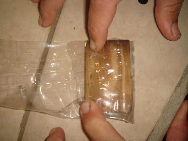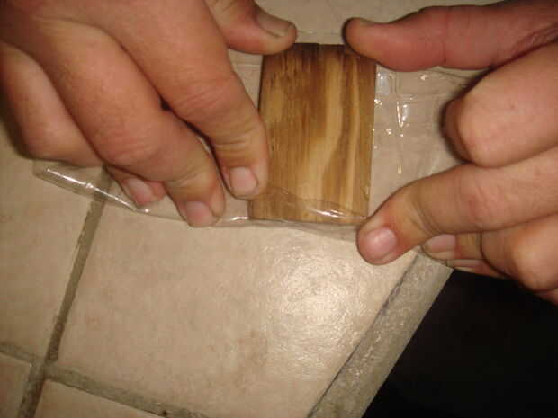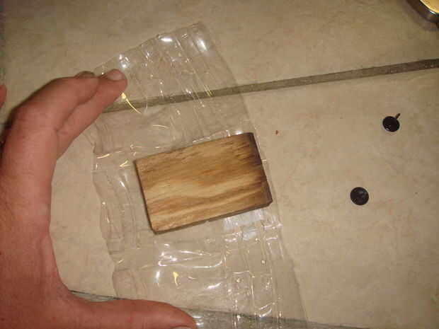 Luego necesitas cortar la botella grande por lo que se pueden doblar los lados de la botella alrededor de la pieza de madera corta. Después de doblar los lados necesitará utilizar su tachuelas (o clavos) y un martillo para sujetar el plástico a la madera. Porque el plástico se reducirá y si no se hace a la madera se dobla el plástico en todas las direcciones.