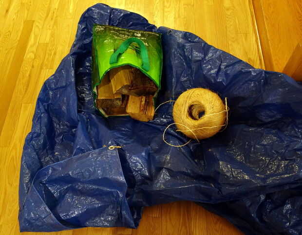Todo lo que realmente necesita es una lona, plástica laminado (incluso la bolsa llegó su colchón). Necesitaba leña para evitar que la lona volando y la guita es proporcionar algunas opciones de remolque.