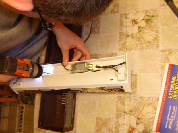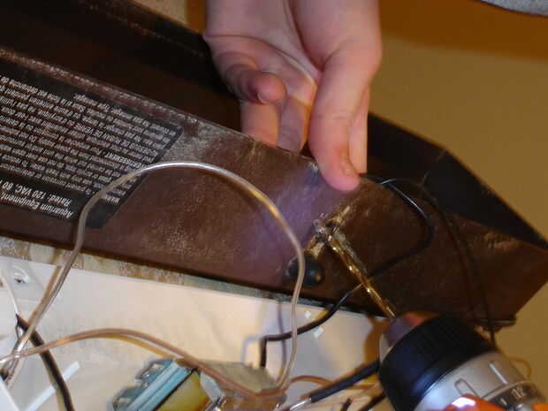 a continuación vamos a taladrar los agujeros en la campana para dar cabida a los diodos LED y los cables de alimentación. Para el LED, comienzo pequeño y trabaje hasta un tamaño que funciona bien. Cuando termines con eso, inserte el LED observando que la polaridad coincide con sus planes.