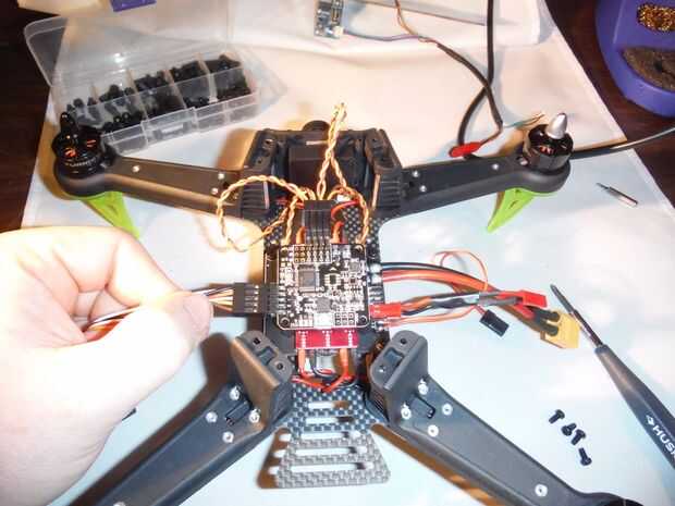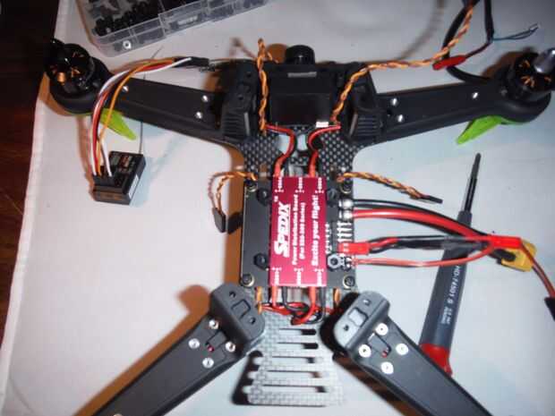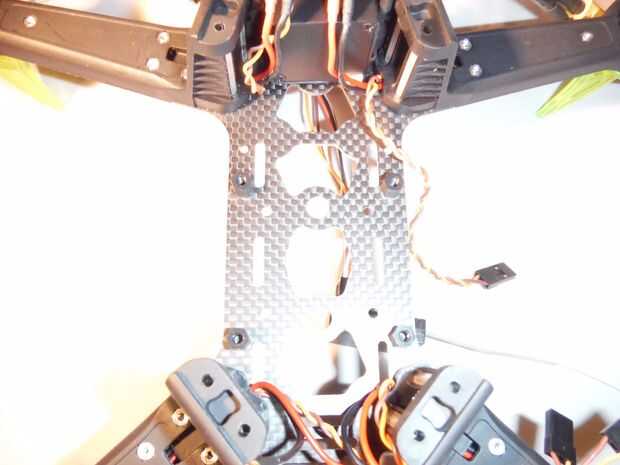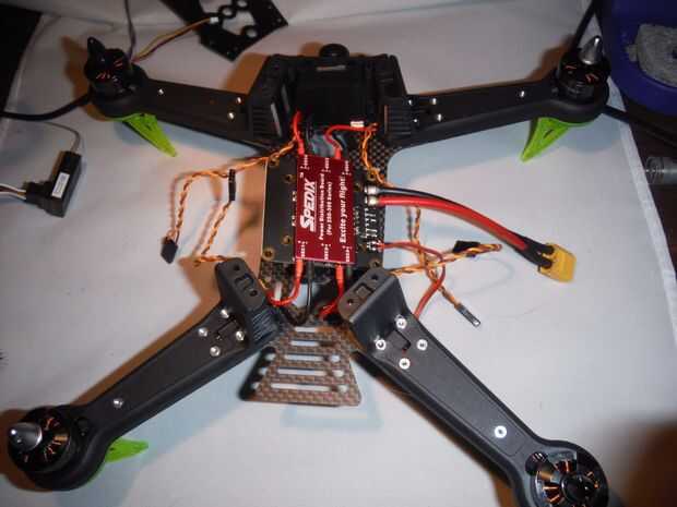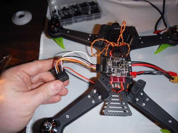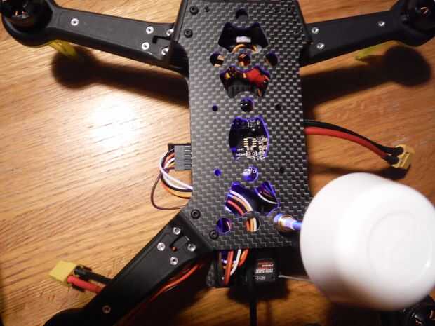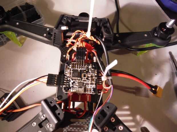Después envían los cables de señal y receptor de cable de potencia bajo el tablero de distribución de energía. Asegurado en su lugar con 4 tornillos de nylon que vinieron en mi surtido de enfrentamiento (no incluido). Luego montado el controlador de vuelo de Naze32 con la flecha de referencia / conexiones de salida hacia adelante (hacia la cámara). Aseguró el receptor a la cola de castor, con más de 3M de cinta, manteniendo el que todo el cableado cerca de la parte interior y limpio como sea posible.