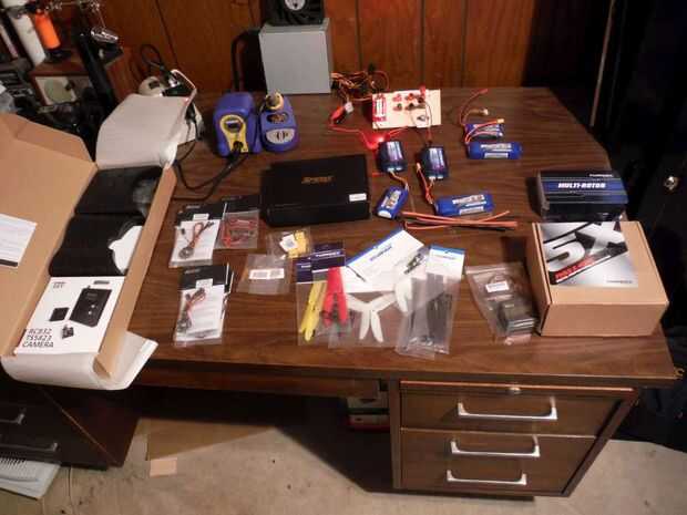 - Aviónica - transmisor (TX), controlador de vuelo del receptor (RX), 4 motores, controladores de velocidad electrónicos y hélices 5 y 6 pulgadas