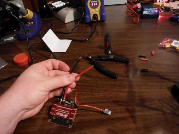La Spedix ESC y PDW vinieron ya soldadas hasta con calor de conectores 2mm bala shrinked y listo para ir. Esto solo ahorra por lo menos una hora o 2. Si el esc eligió un ESC diferentes que la lista de piezas, soldadura 3 tomas a cada uno de los cables del lado del motor y 2 balas con el lado de la distribución de alimentación de la ESC. Vaya por delante te esperaré.