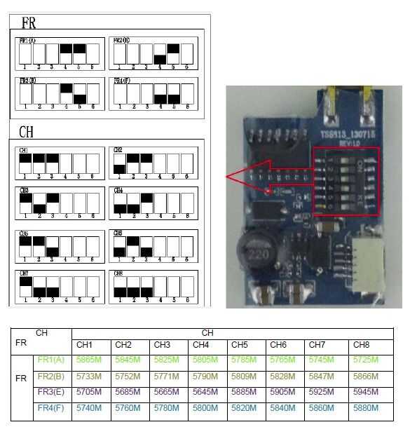 - Configure el video transmisor dip switches a uno de los 5 permitida canales utiliza el canal 1