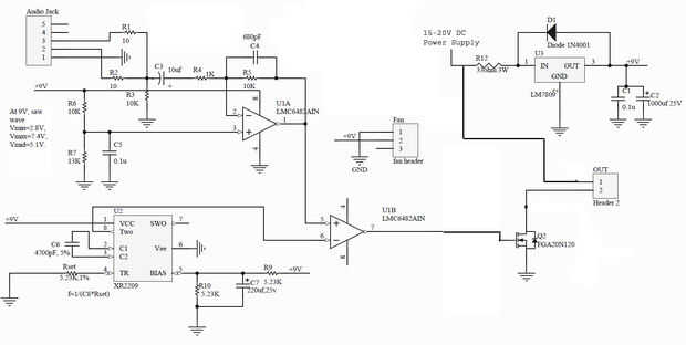 XR2209 IC está configurado como generador de onda de triángulo. La frecuencia de salida se establece en 40KHz. La frecuencia se ajusta cambiando el valor de C6 y Rset (XR2209 comprobar hoja para más detalles). A parte de IC LMC6482 se configura como invertir el amplificador. Amplificadores audio de la señal cerca de 10 veces. La ganancia es fijada por R5/R1. Puesto que la onda triangular se centra alrededor de 5.1V, la salida de la parte A de LMC6484(pin 1) necesario cambiar de puesto al mismo nivel para obtener 50% ciclo de trabajo cuando la señal de audio es cero. El nivel de compensación se establece por divisor de tensión R6/R5. Parte B de LMC6484 se utiliza como comparador. Cuando un voltaje en el pin 5 es mayor que en el pin 6, el opamp salida el valor máximo, que es de 9 voltios en este diseño; Cuando un voltaje en el pin 5 es menor que en el pin 6, el opamp dará salida a su valor mínimo, que es cero en este diseño. La señal de salida en el pin 7 es una señal PWM, y la señal PWM enciende y apaga la potencia mosfet Q2. La carga del circuito se conecta entre la fuente de alimentación Vcc y el desagüe de Q2.