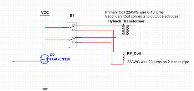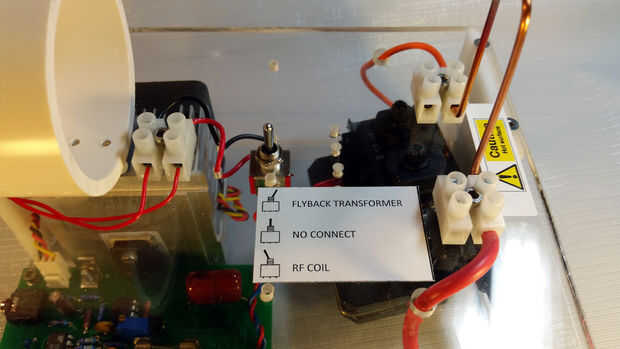 Para fácil y rápido cambiar entre la función de altavoz de plasma y demostración RF, utilizo un DPDT a interruptor de la conexión entre el transformador flyback y la bobina de RF.