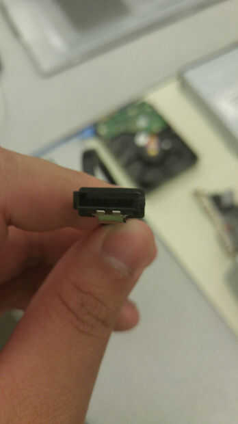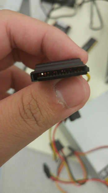 5. (imagen 7 y 8) Encuentra y conecta el cable de alimentación SATA (en la alimentación) en el puerto correspondiente en el disco duro, hasta que encaje en su lugar.
