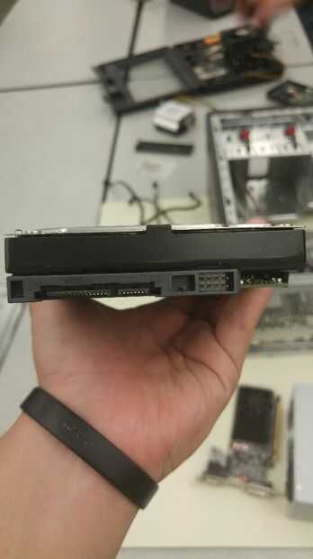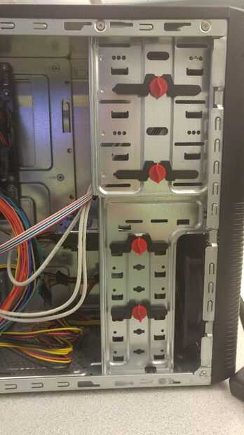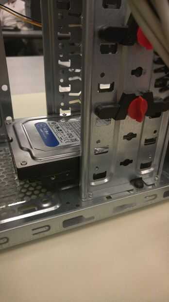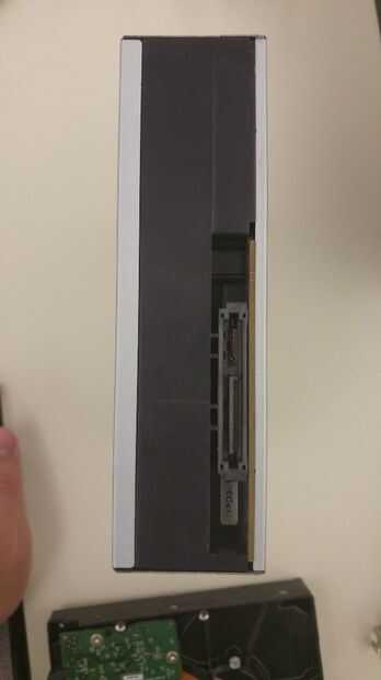 1. (2 º y 3 º foto) Cerca de la parte delantera de la caja, debe ser un rack de disco duro en la parte inferior. Coloque el disco duro en la rejilla inferior y alinee los orificios en el lado de la unidad de disco duro con los orificios en el lado de la cremallera, como se ve en el cuadro 3.