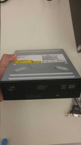 6. (imagen 2) (Solo hacer los pasos siguientes si tiene una unidad óptica) Hay un rack para unidades más grandes, tales como unidades ópticas, por encima de la rejilla de unidad de disco duro. Coloque la unidad óptica en la bahía superior y alinee los agujeros en los lados de la unidad óptica con los agujeros en el lado de la parrilla.