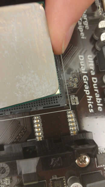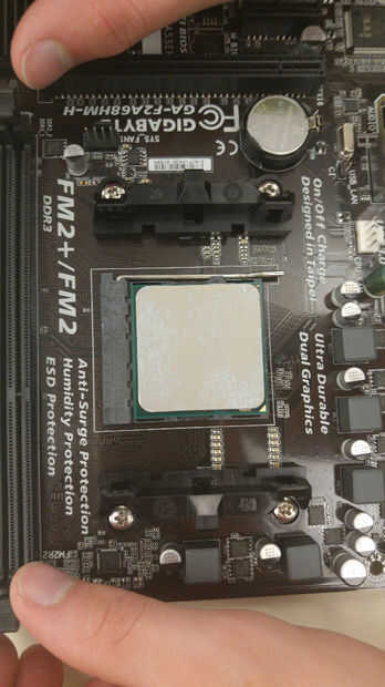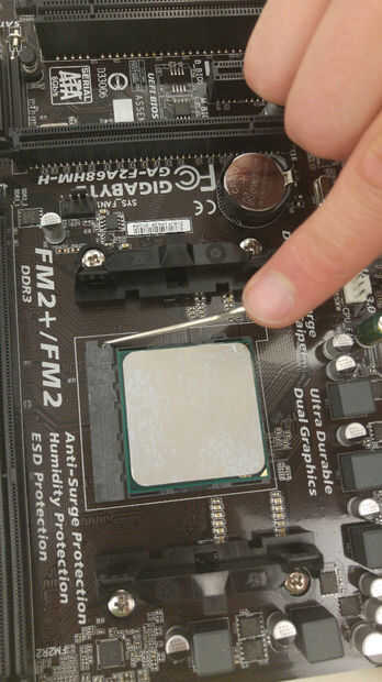 4. Baje con cuidado el CPU en el socket, asegurándose de que no utiliza ninguna fuerza. Si alinean correctamente, sólo debe caer en su lugar.