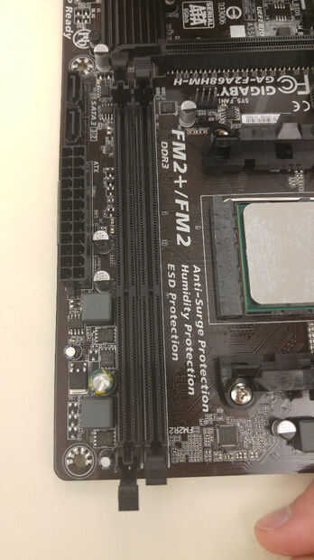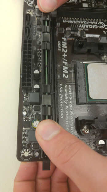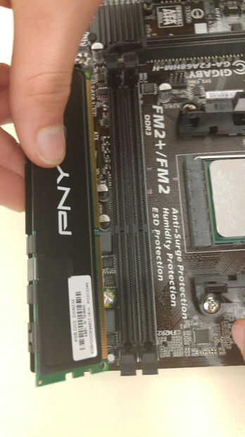 3. (imagen 4) Inserte firmemente el palillo de la memoria RAM en la ranura DIMM, asegurándose de que presione a ambos lados, hasta las pestañas en el lado de la ranura DIMM en su lugar.