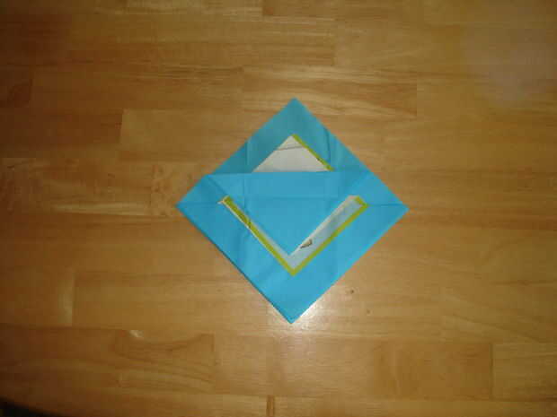 Doblar las dos esquinas al mismo tiempo al mismo punto de la servilleta de acento sólo doblado... cubriendo el blanco aburrido a lado de la servilleta de acento.