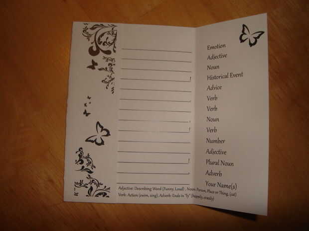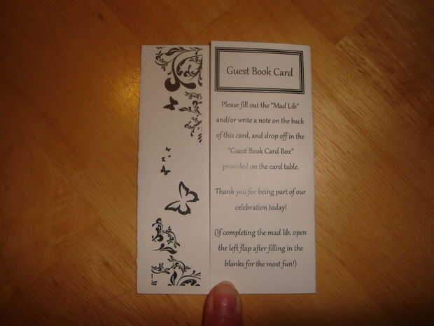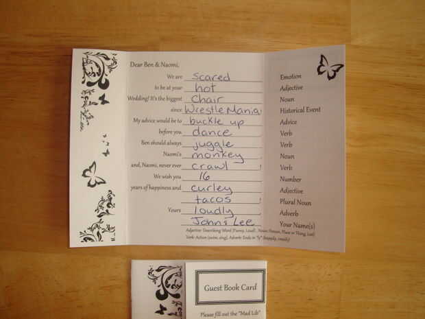 "Por favor complete el"Mad Lib"o escribir una nota en la parte posterior de la tarjeta y dejar en"Los libro tarjeta de caja"en la mesa.