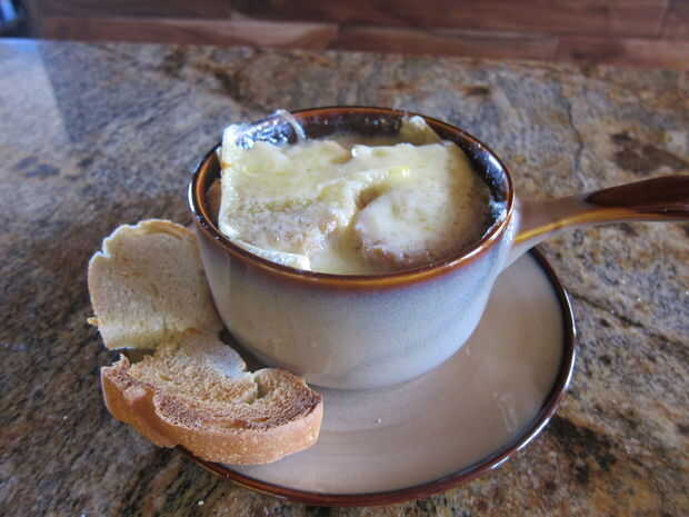 Vierte la sopa en tazones seguro horno y añadir la sopa con una rebanada de pan y una rebanada de queso.
