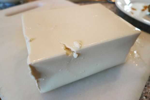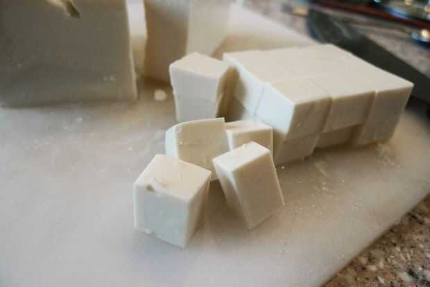 Retire con cuidado el queso de soja del paquete. Corte alrededor de un cuarto del bloque (también se puede medir 50 g) y cortar en pequeños cubos del tamaño de la mordedura. Caer suavemente en el bote.