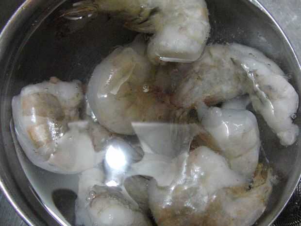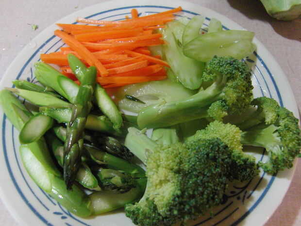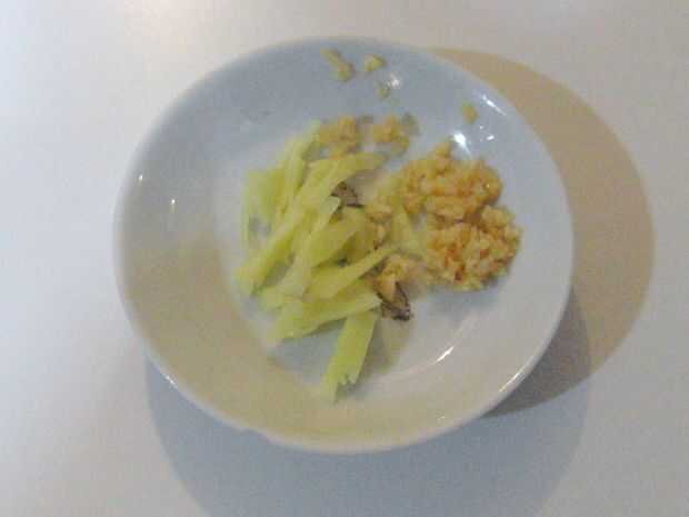 he utilizado camarón congelado asi que remojadas en agua para descongelarlo. También lavado y picado encima de las verduras que estaría utilizando. Zanahorias, apio, espárragos y brócoli son las clases utiliza (les hierve en agua para ablandarlas primero). Puede haber muchas variaciones a esta receta. Como dije antes, si usas solo el udon y las verduras, sería una media de vegano delicioso. Tirar algunos tofu para la proteína. Añadir algún pollo o alguna carne. Hay tantas posibilidades! Esto también es el momento de preparar el ajo y el jengibre. Picar en trozos pequeños y reservamos para utilizarlo más adelante.