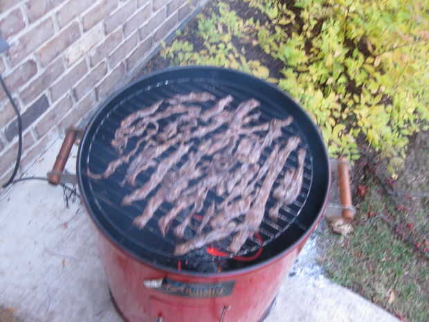 Lejos del calor, colocar la carne en tiras perpendicular de las barras de metal. Mirando hacia atrás, creo que debo han colgado los en su lugar. Eso es mejor pues significa theres no hay necesidad de voltear la cecina más adelante.