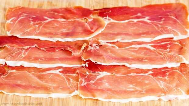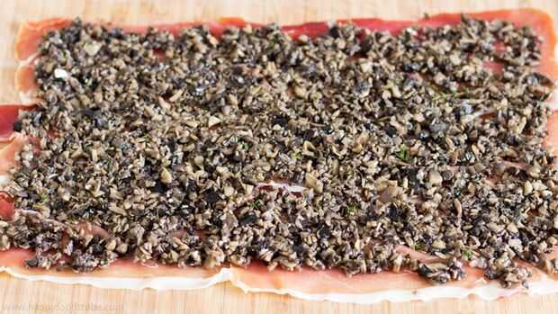 4. Coloque el film transparente sobre su encimera de mesa y cubrir con rebanadas de proscuitto/parma/jamón 6. Asegúrese de que las láminas solapan entre sí. Ahora extienda las setas sobre crear una capa uniforme.