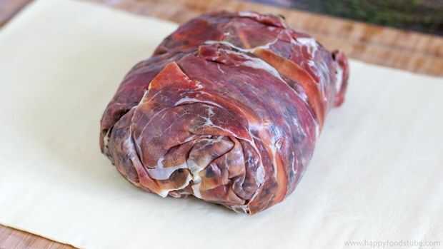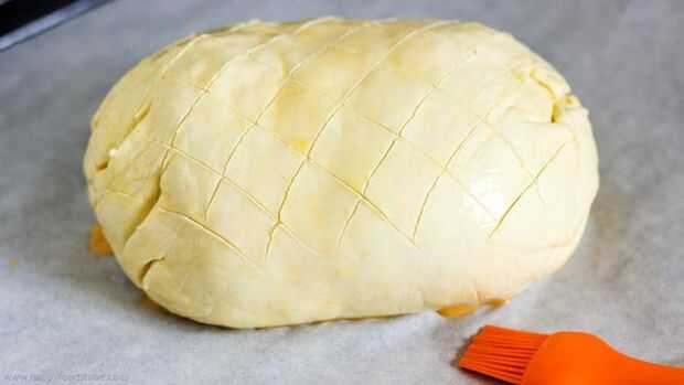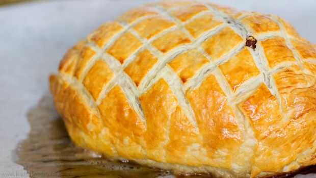 6. media hora más tarde: sacar la carne de la nevera. Retire el film transparente. Coloque la nueva hoja de film transparente en la parte superior de su trabajo. Poner el hojaldre sobre el film transparente y colocar la carne en el centro. Rodillo la masa de hojaldre sobre la carne. Recorte la masa sobrante y séllalo con huevo. Selle ambos extremos pellizcando la masa con los dedos.