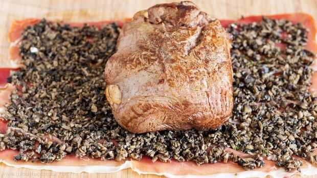 5. Coloque la carne en el centro y doblar cuidadosamente el jamón con champiñones sobre el abrigo de carne la carne con film transparente. Asegúrese de que se enrolla firmemente. Ahora tome los extremos y girar hasta que la carne es realmente herméticamente y tiene forma de barril ver. Poner en la nevera durante 30 minutos.