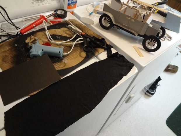 Tuve varias ideas para el tipo de material se va a utilizar para la parte superior y terminó usando simplemente una camisa vieja que tenía. Primero hice un vidrio trasero usando un pedazo de papel plástico y negro. Corte la tela al tamaño correcto y caliente lo había pegado en la parte superior del marco en pequeñas manchas dejando holgura para apertura y cierre suave. Corte un pequeño agujero de la tela sobre el vidrio trasero y caliente encolar la tela alrededor de él.