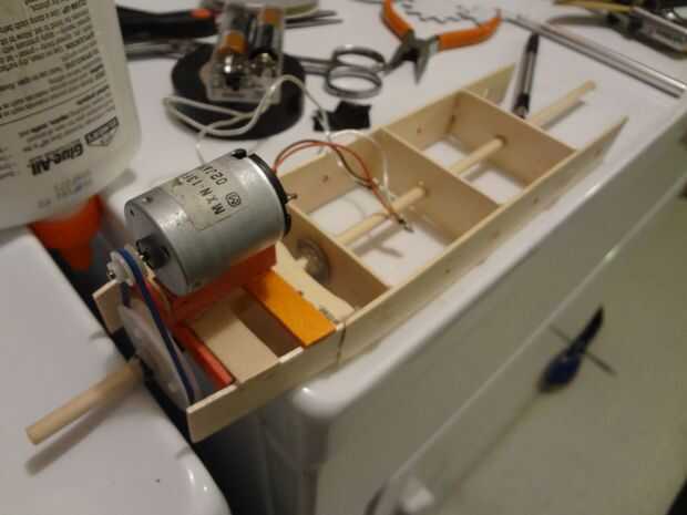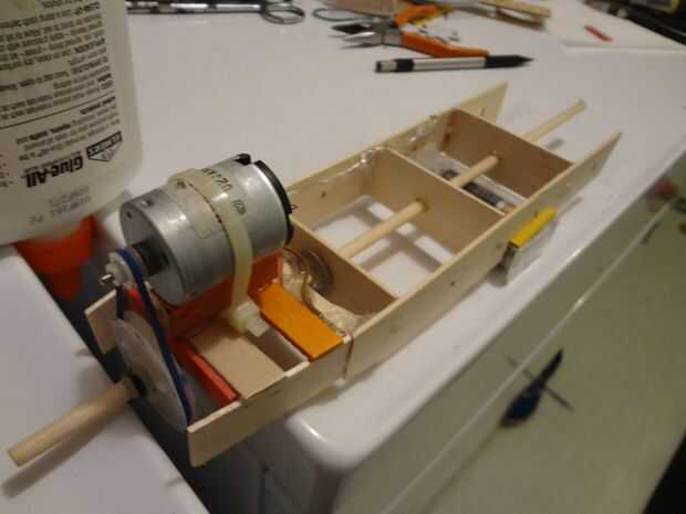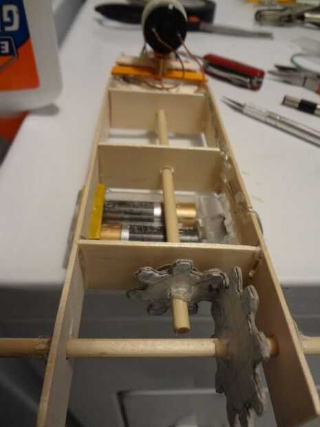 Luego monta la polea al frente de la transmision con el motor. I entonces construyó una estructura para soportar el motor & alineados la polea en el motor y el eje y caliente lo había pegado en lugar. Entonces yo había asegurada en su lugar usando un lazo de nylon. He perforado un agujero en el engranaje más pequeño cartón y resbalaron sobre el eje de transmisión trasero pegado en lugar. Después perforó un agujero en el engranaje más grande y pasado el eje trasero a través de él. Malla correctamente los engranajes para arriba y luego pegan el engranaje más grande en el lugar en el eje trasero. Pegué poco perforar las arandelas en el eje dentro de cada lado de la framerail para mantener el árbol en lugar y engranajes engranando correctamente, lo que permite una pequeña sala de meneo para que funcione correctamente. Cableado de la caja de batería en y probada y tuvieron que recortar un poco en los engranajes para conseguir trabajo bastante suavemente.