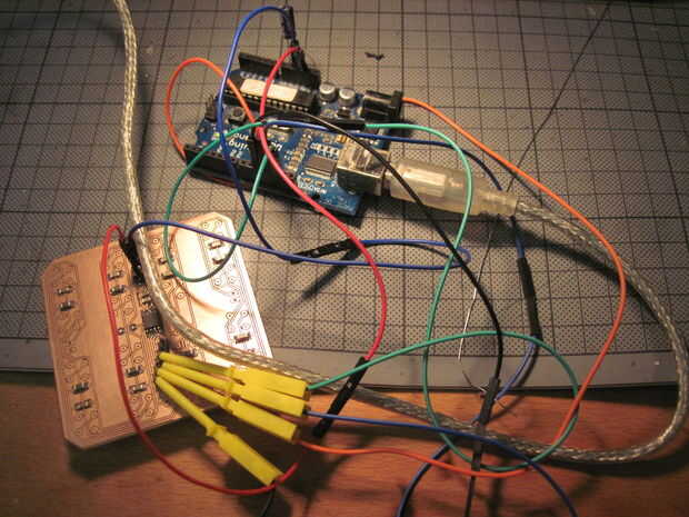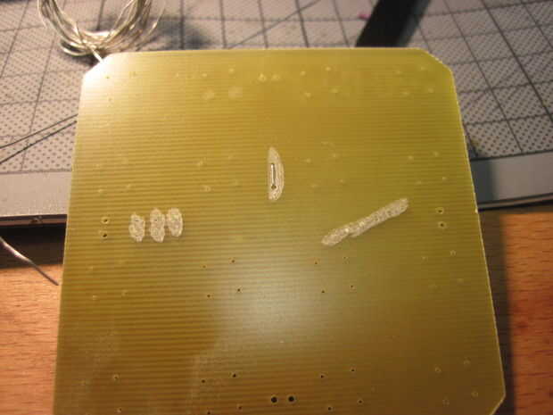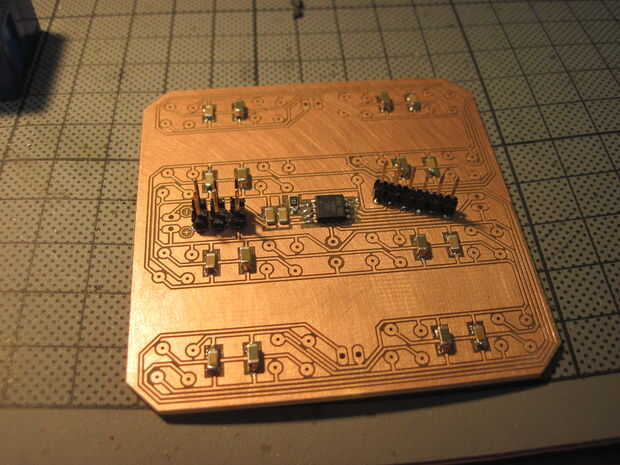Luego de la soldadura el Attiny, condensadores etc. en el PCB. Un cable de puente tiene que ser en el otro lado - que le todavía plano decidí un pequeño canal en el PCB (y quitar el resto del pinheader en la parte inferior - foto cuarta) del molino e inserta el alambre de plata en el canal.