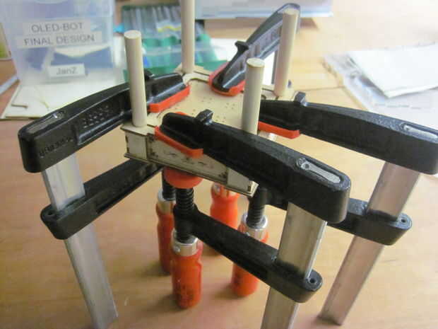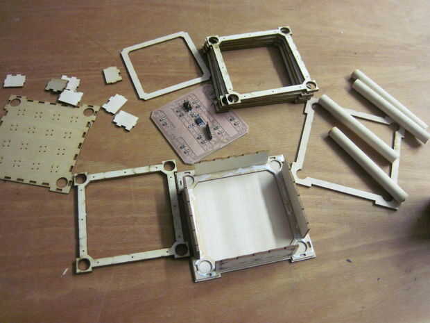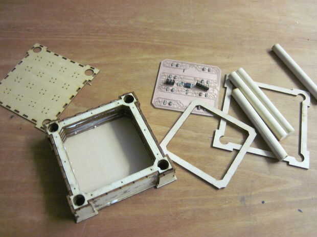 El proceso de construcción es bastante simple: sólo apilar las piezas más grandes, la madera redonda alinea. Inserte las paredes pequeñas en las ranuras correspondientes (espiga más pequeña hacia arriba). Pegar con pegamento para madera - aparte de la capa inferior de la madera, que servirá como una especie de escotilla para cambiar las pilas. He añadido los agujeros pequeños en cada capa para tornillos pequeños, pero hasta ahora las espigas de los lados son lo suficientemente fuertes como para sostener la parte inferior por la fricción.