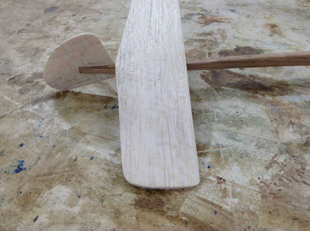 -El ala sobre el fuselaje 3" a 3,5" de la nariz de epoxy con el borde mirando hacia el frente. Asegúrese de que los extremos son la misma distancia vertical desde el suelo a cada lado. Encontré que el ala tenía una tendencia hacia la punta, por lo que puede sostener un lado del ala.