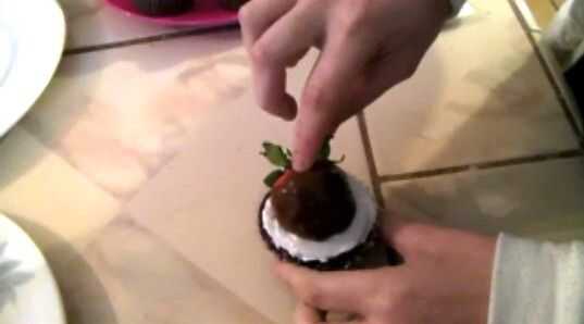 paso uno: hacer su favorito recepie chocolate y hornear en cupcakes jumbos.Paso dos: Permite enfriar y con un pequeño cuchillo de emparejamiento lindo un tamaño de forma de cono en el centro de la Magdalena antes de colocar la fresa en el centro. (Pr