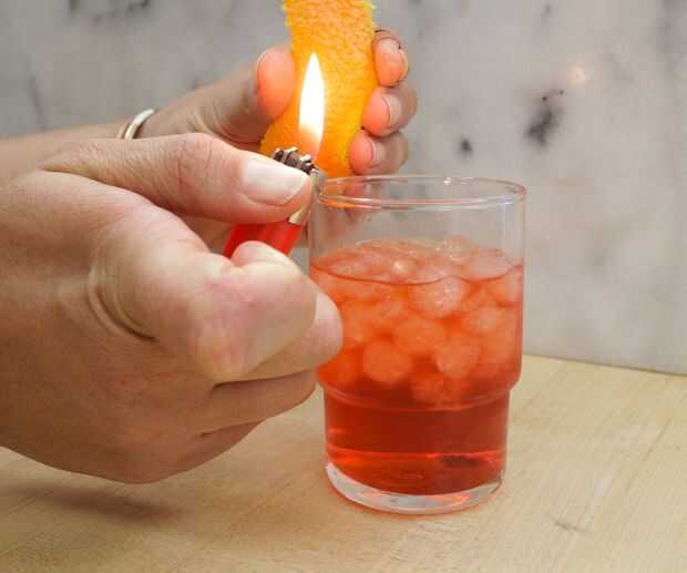 Pellizcar el giro bruscamente, expulsando el aceite de la piel, a través de la llama y a la superficie de la bebida.