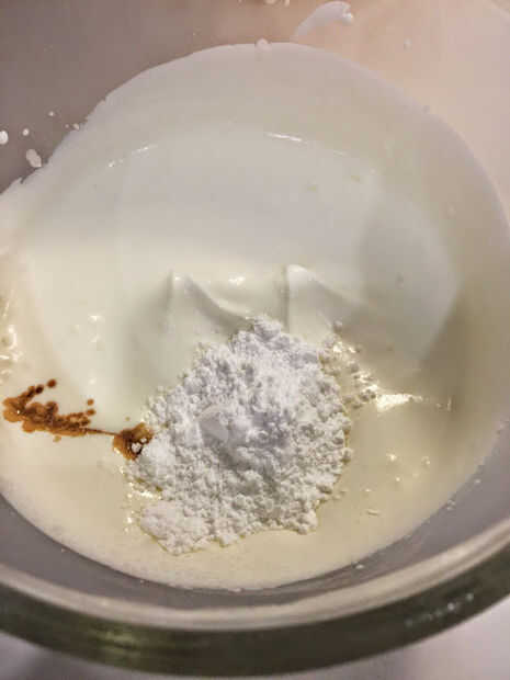 Añadir la vainilla y el azúcar; seguir para batir a velocidad media hasta que los picos suaves volver, 2 a 3 minutos.