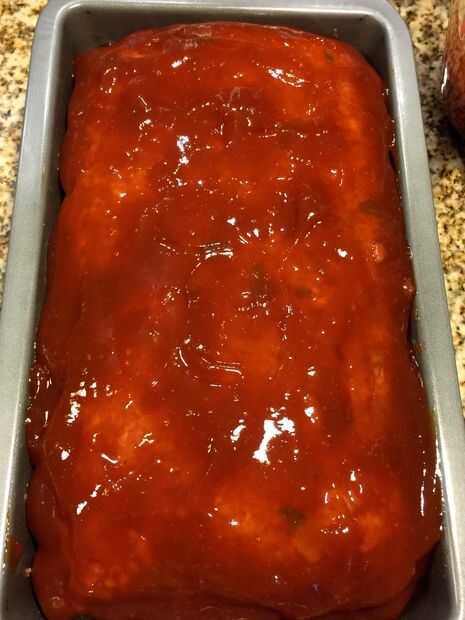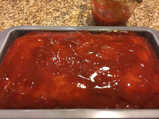 Usando la mitad de la salsa de tomate relleno de mezcla, extender uniformemente sobre la parte superior la del pastel de carne, reservando el resto para uso posterior.