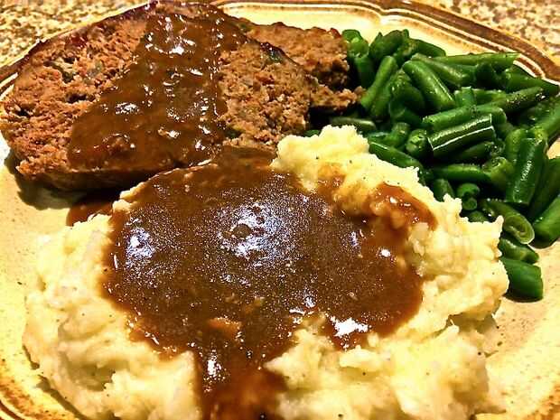 Con una espátula larga, saque el pan de carne de la cazuela. Vierta el pan jugos en una cacerola pequeña y colóquelo en la estufa, a fuego alto. En un tazón pequeño, batir la harina con 2 cucharadas de agua. Batir la mezcla en la salsa. Llevar el líquido a ebullición luego reducir el calor a medio-bajo y cocine a fuego lento, removiendo con frecuencia, hasta que forme una salsa ligeramente espesada, unos 5 minutos. Sazonar la salsa con sal y pimienta. Una cena americana clásica cuando se sirve con el puré de patatas cremoso en el lado. Sirve: 10 porciones.
